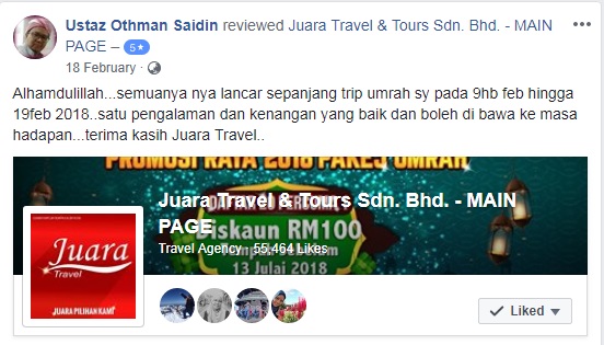 Dari pada apa yang aku baca di Facebook Juara Travel., terdapat banyak review positif dari peserta yang teleh mengikuti pakej dari Juara Travel antaranya